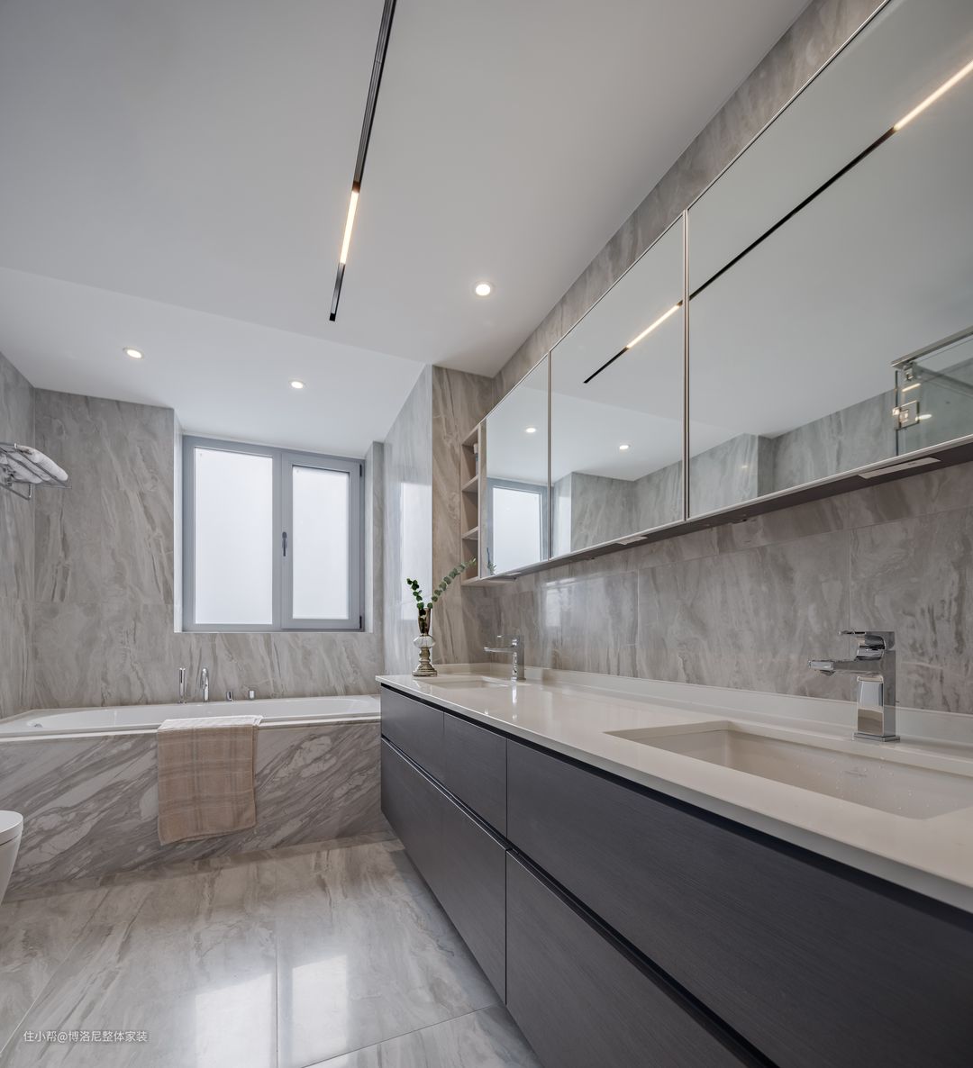 卫生间:马桶和洗手台分列两侧,这样的空间更为宽敞,配合淋浴+泡浴的模式,显得主人的高雅品质的生活。