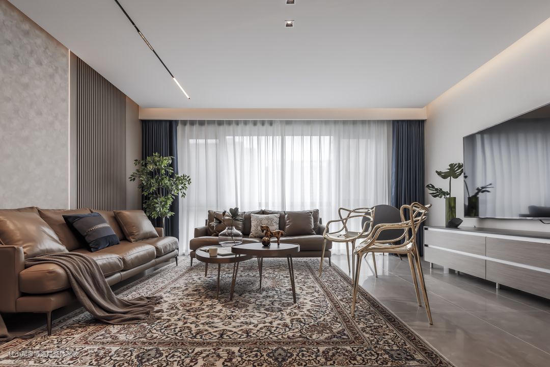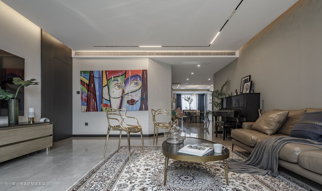 客厅:宽大柔软的皮质沙发,铺上花式的地毯,搭配一张简易茶几,优雅、舒适、温馨。客厅中抽象的装饰画,为整个空间附上了灵魂,优雅灵动。定制电视柜增加了客厅的收纳空间,保持了空间整洁的视觉体验。