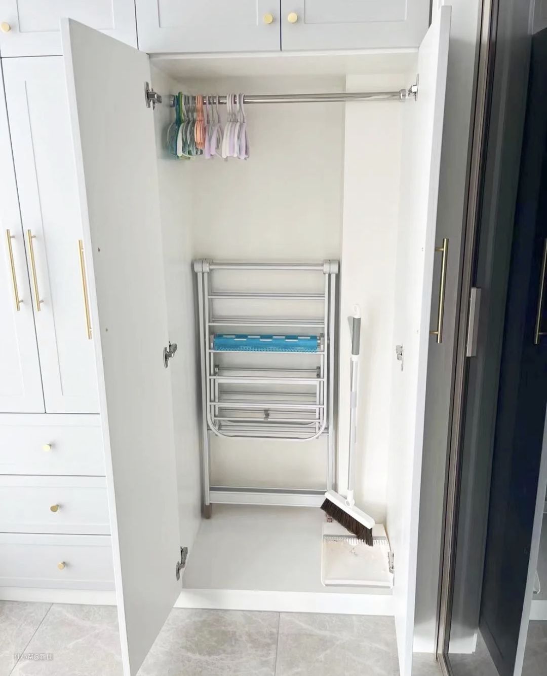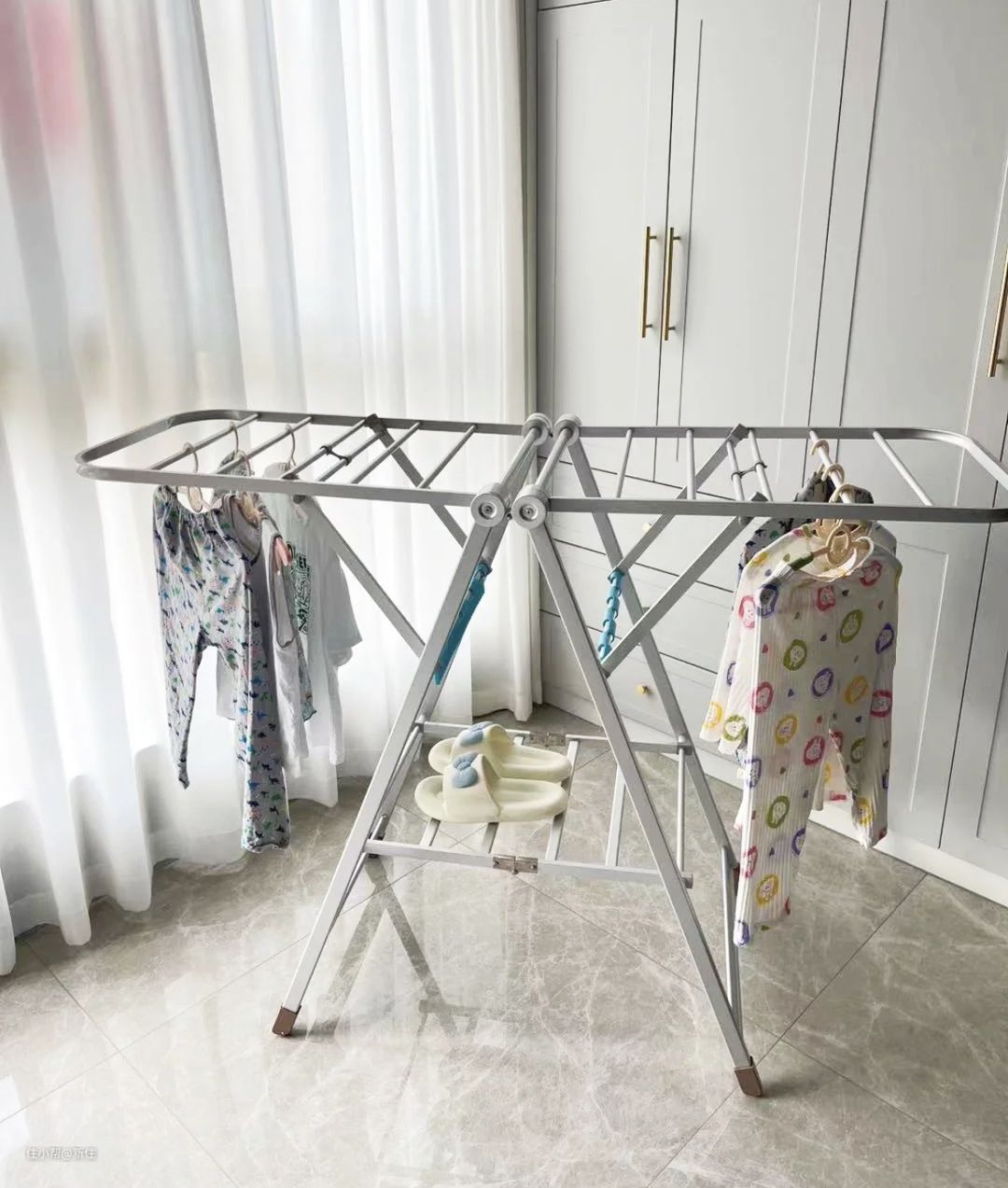 见到她家的晾衣架,折叠后就是一个薄片,能直接放进柜子里,我果断给家里也买了一个。