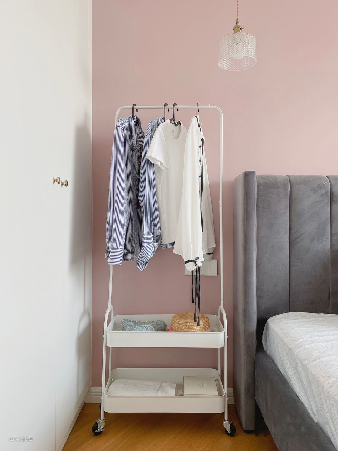 简约的白色,百搭、放哪里都好看,长方形的架子,靠在衣柜一旁、或墙角,贴合墙面不占空间。