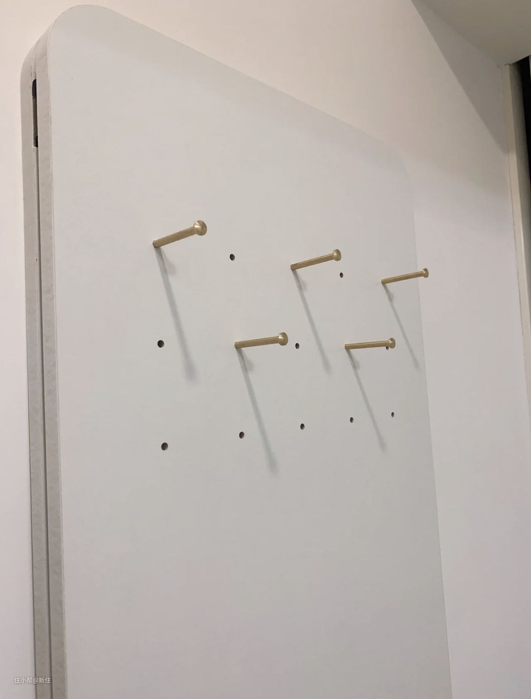 上面一层是木质洞洞板,下面一层是全身镜,两层之间滑轨开合,镜子可隐藏,板子可挂衣服。