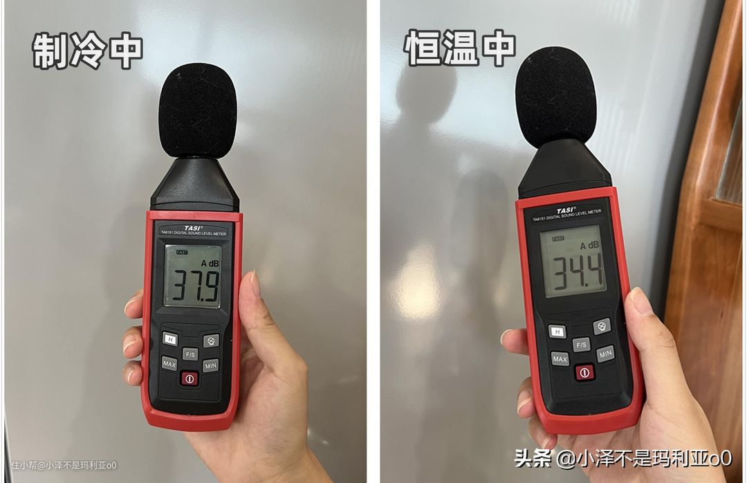 ▼最后就是噪音方面,有着一级能效和变频压缩机的加持,噪音方面的表现自然不用过于担心,实际测试下来冰箱在制冷环节的噪音不到38dB,只有很轻微的嗡嗡声,而恒温状态下,加上环境因素的干扰,也仅仅在34.4dB,即使是在安静的夜晚也近乎与一种无感的状态。