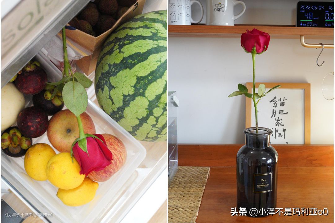▼我把其中一只玫瑰花放进博世KAN98VA59C的鲜润保鲜空间,另一只则放进花瓶中加入清水正常培养。