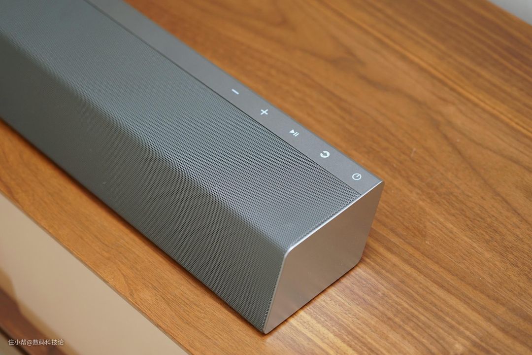 回音壁整体为金属外壳+金属网罩的设计,这是其在用材上与低端回音壁塑料大壳+防尘网布的最大区别。金属腔体的好处是可以降低谐振及共振导致,从而保持重低音的相对干净、中音的清晰度、以及高音的解析力。