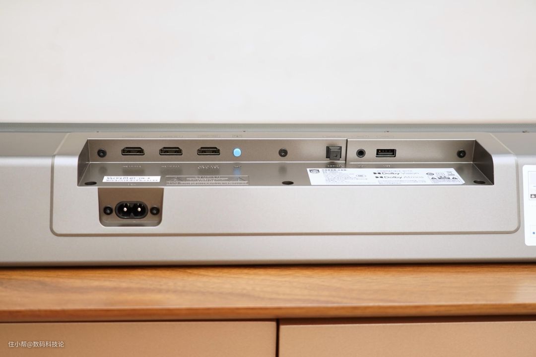 回音壁的长条主音箱接口主要集中在背部,包括直插U盘播放的USB、支持4K超高清、120Hz高刷的HDMI2.1接口(其中一个支持eARC/ARC回传功能)、光纤接口,Aux传统接口以及Wi-Fi配对按键。这意味着HiFi播放器、电视、智能投影仪、游戏主机、笔记本电脑等都可以近乎完美兼容。
