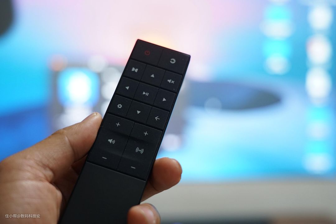 从棱角设计来看,平行四边形的造型,有个性又不失棱角感,观感上也挺好看的。并且遥控器也是采用了类似的设计元素,整体显得很雅致。