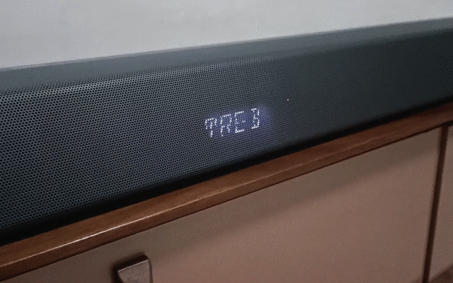 另外从输出效果上来说,其支持音乐、电影、新闻、运动、自定义等多种模式匹配。模式切换也很简单,直接选设置键就是循环选择,并且选定的模式可以通过条形音箱中间的点阵LED显示灯看到状态。