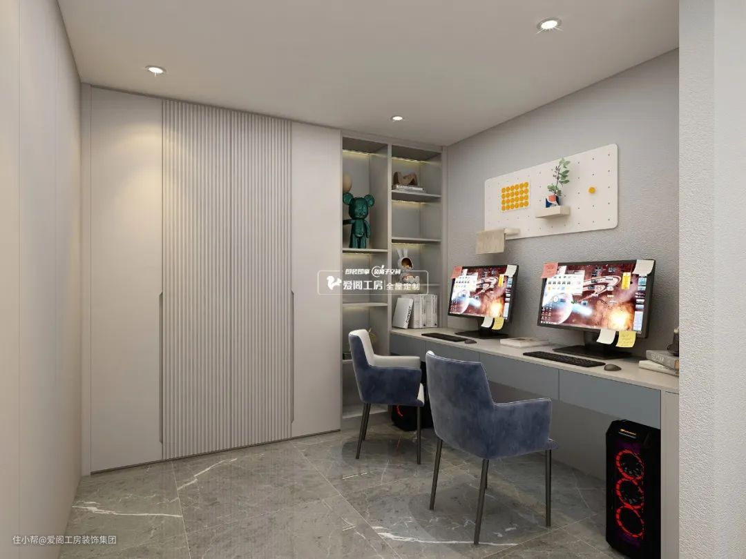 夫妻二人都有办公需求或家里有两个孩子需要学习空间,可以入手一张足够长的桌子贴墙而放,再配两把椅子,双人办公区并没那么难设计,能够同时满足多人使用。