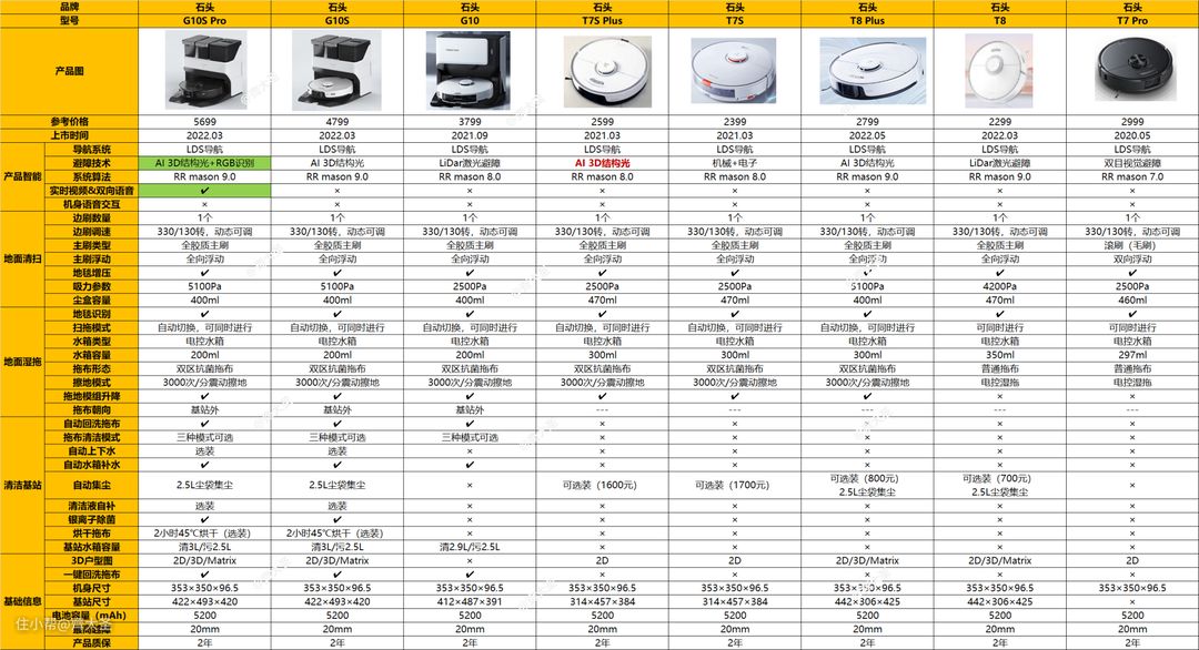 石头的T系列历来是其主打的单机机型系列,从最开始的T5/T6到现在的T8 Plus,基本都是搭载了当年的最近技术。而去年推出的G系列,主打的卖点主要是基站功能,主机的话其实与同年的T系列并无二致。