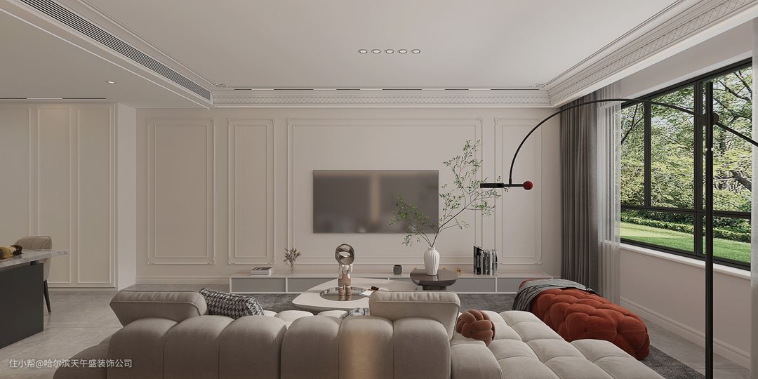 设计理念:客厅地面地砖造型设计大板砖,大纹理,使客厅更有层次 电视背景墙石膏板和石膏线造型,利用弧型设计更有立体感整体偏浪漫法式为主。