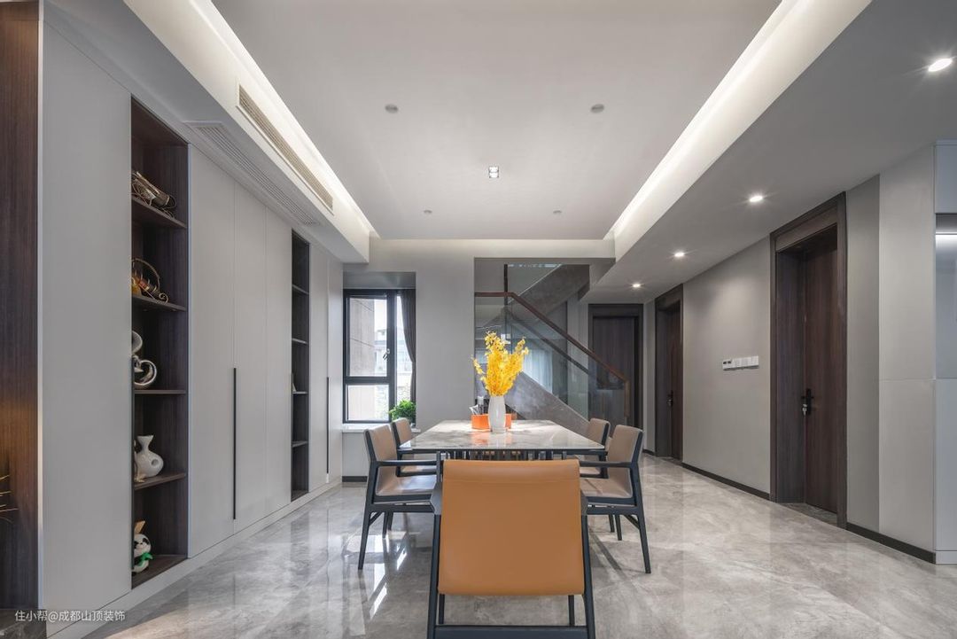 餐厅与客厅连为一体,空间整体感更为强烈,用爱马仕橙餐椅作为点缀,为就餐环境带来一抹亮色,暖心又暖胃。餐边柜半开放半封闭结合,层次分明,造型简洁优雅,为就餐环境增添一丝浓厚的氛围感。