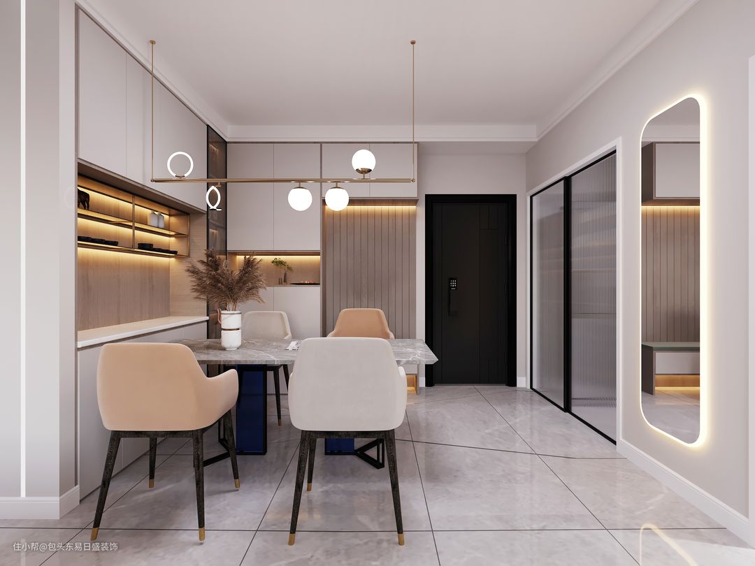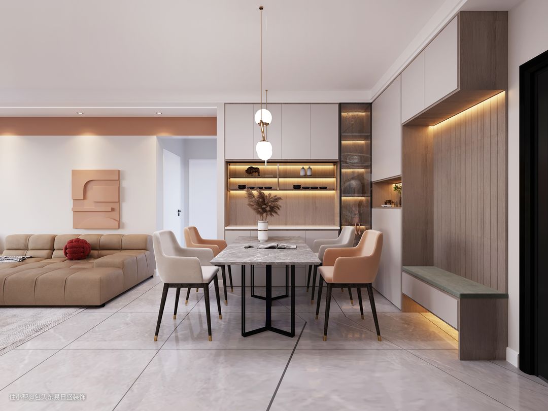 入户后就是餐厅区域,设计师直接结合玄关+餐厅做了L形的收纳柜,靠近入户做玄关柜,靠近餐厅做餐边柜,预留开放空间用来随手放置包包钥匙等。