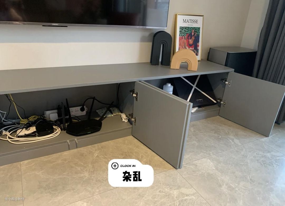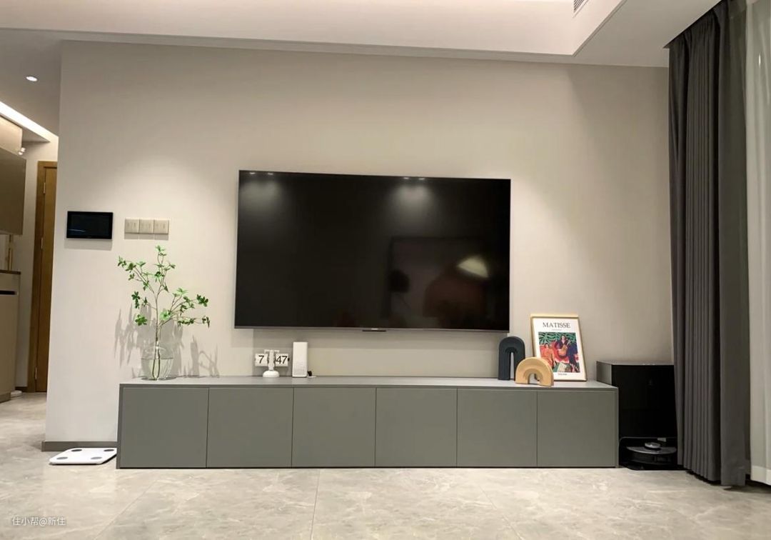 想要美观,还是得掌握“隐藏大法”,像这位住友一样,提前规划,将路由器等全藏在电视柜内,整个电视墙整洁度都大大提升。