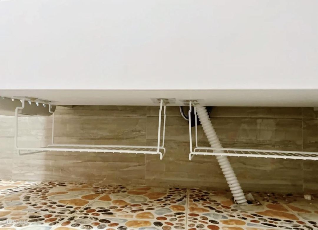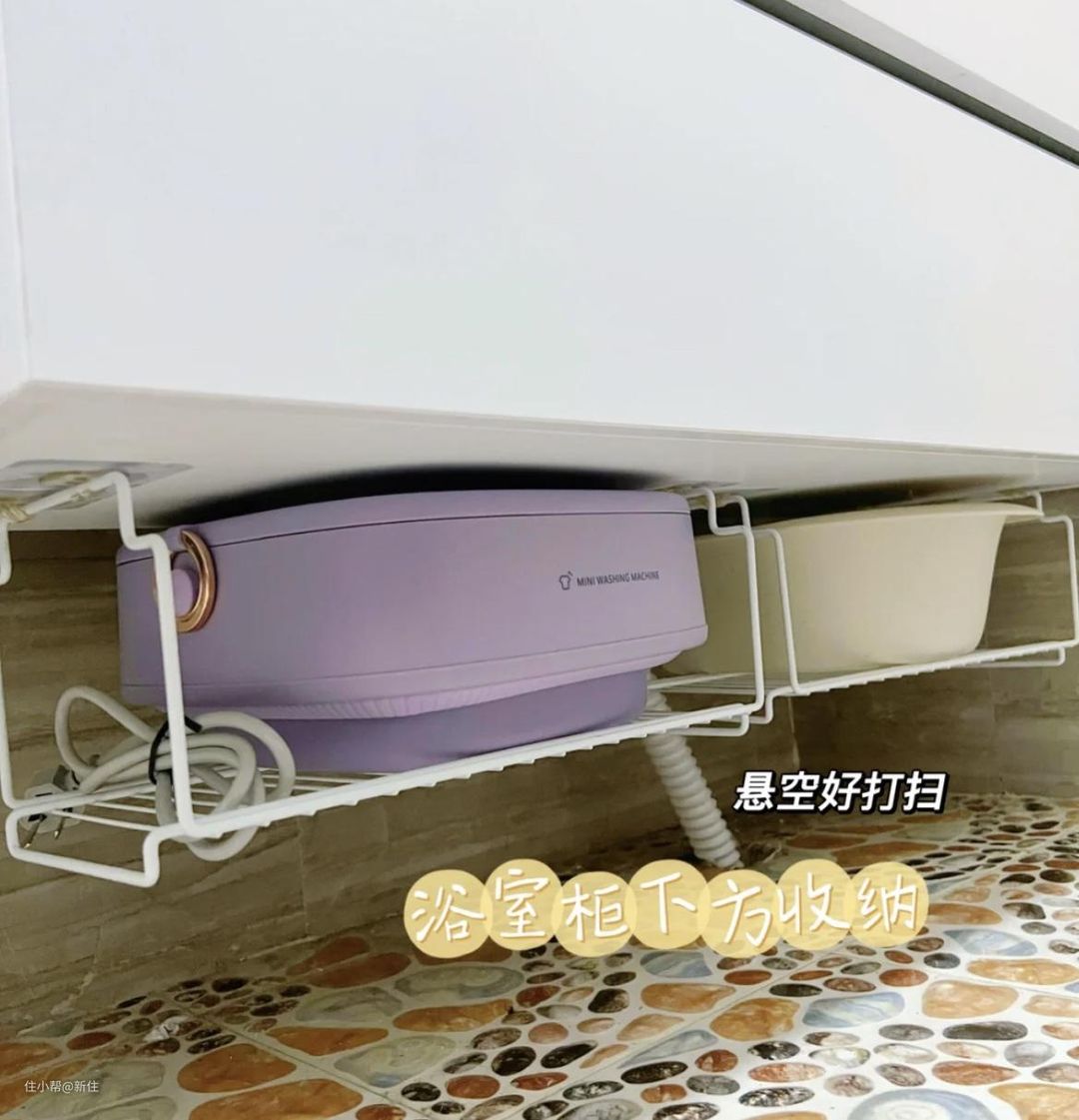 这位住友就很机智,直接将折叠洗衣机和脸盆一样,悬挂在浴室柜下方,收纳、清洁卫生问题都解决了。