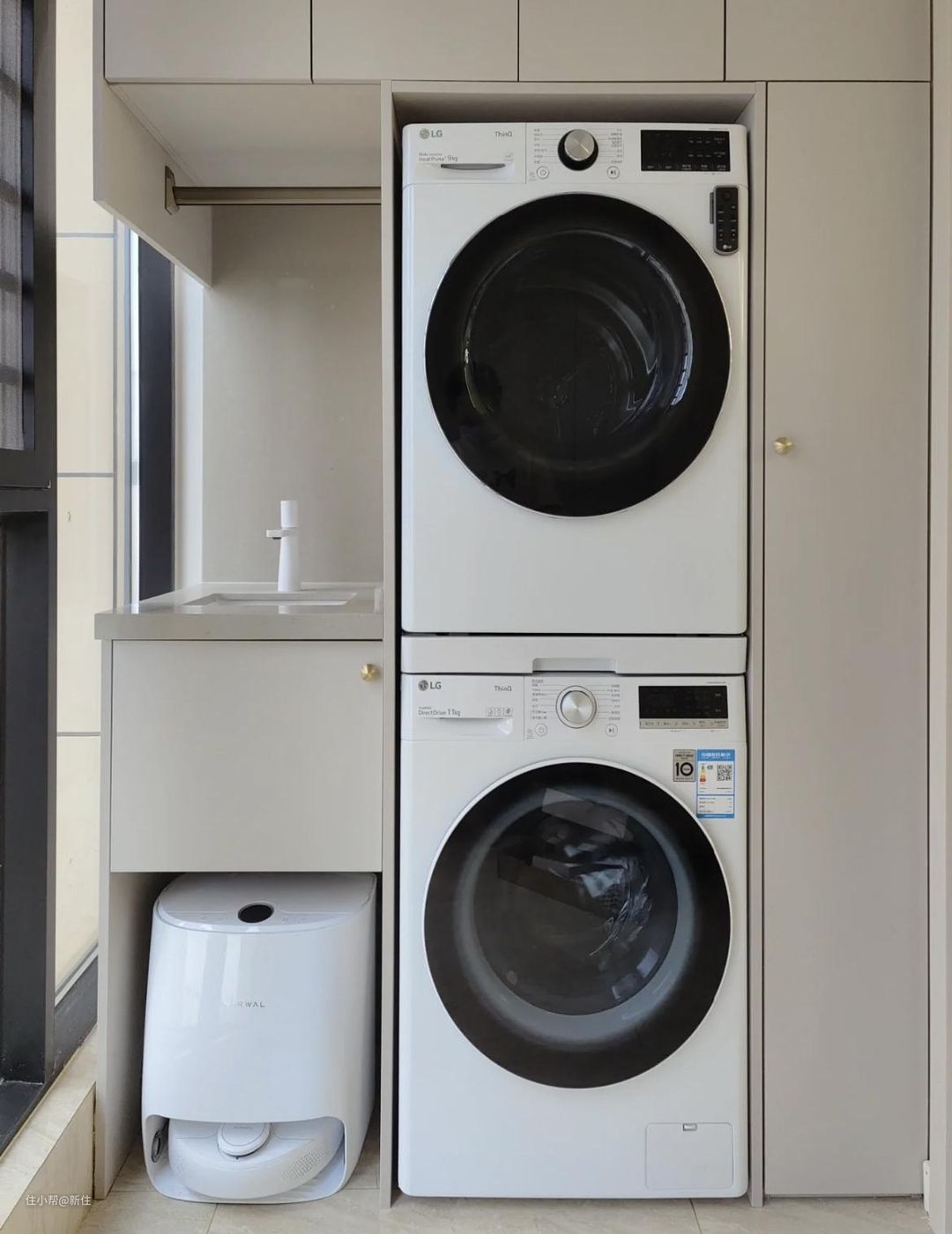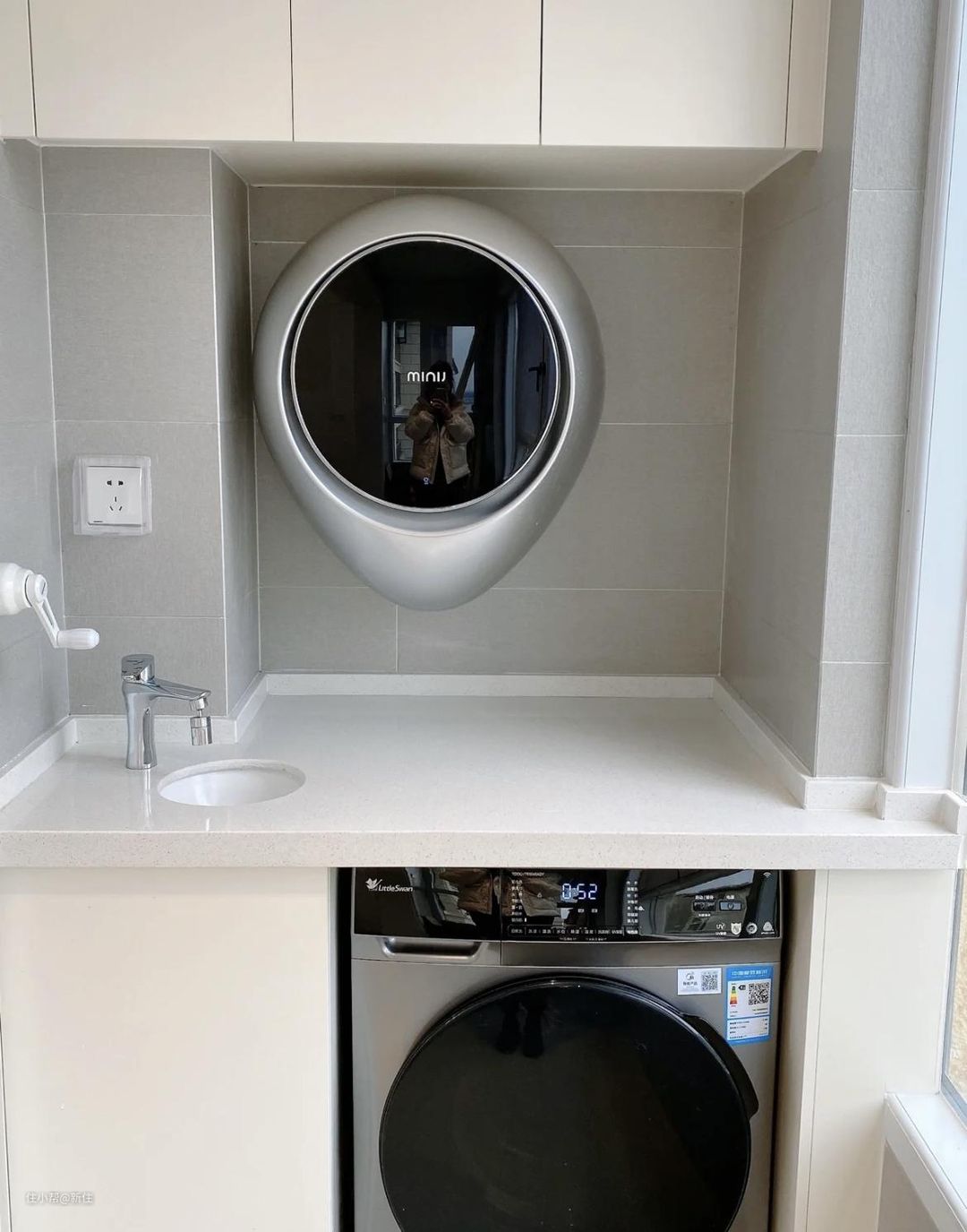 当然,如果预算充足,也可考虑这种壁挂的迷你洗衣机,提前将电路、水路规划好,出来就是如下效果,颜值、科技感十足。