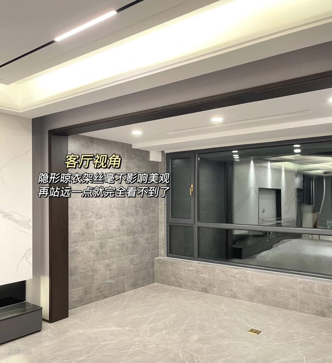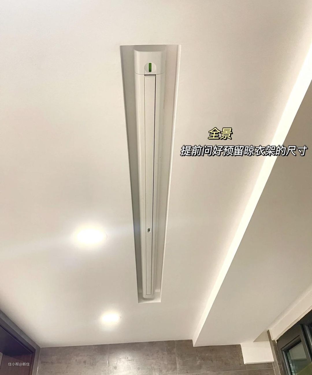 提前定好规格,在吊顶时就交代工人预留好凹槽尺寸,后期晾衣架装上去,隐秘性非常高,不用的时候,在客厅几乎看不到,一点不影响颜值。
