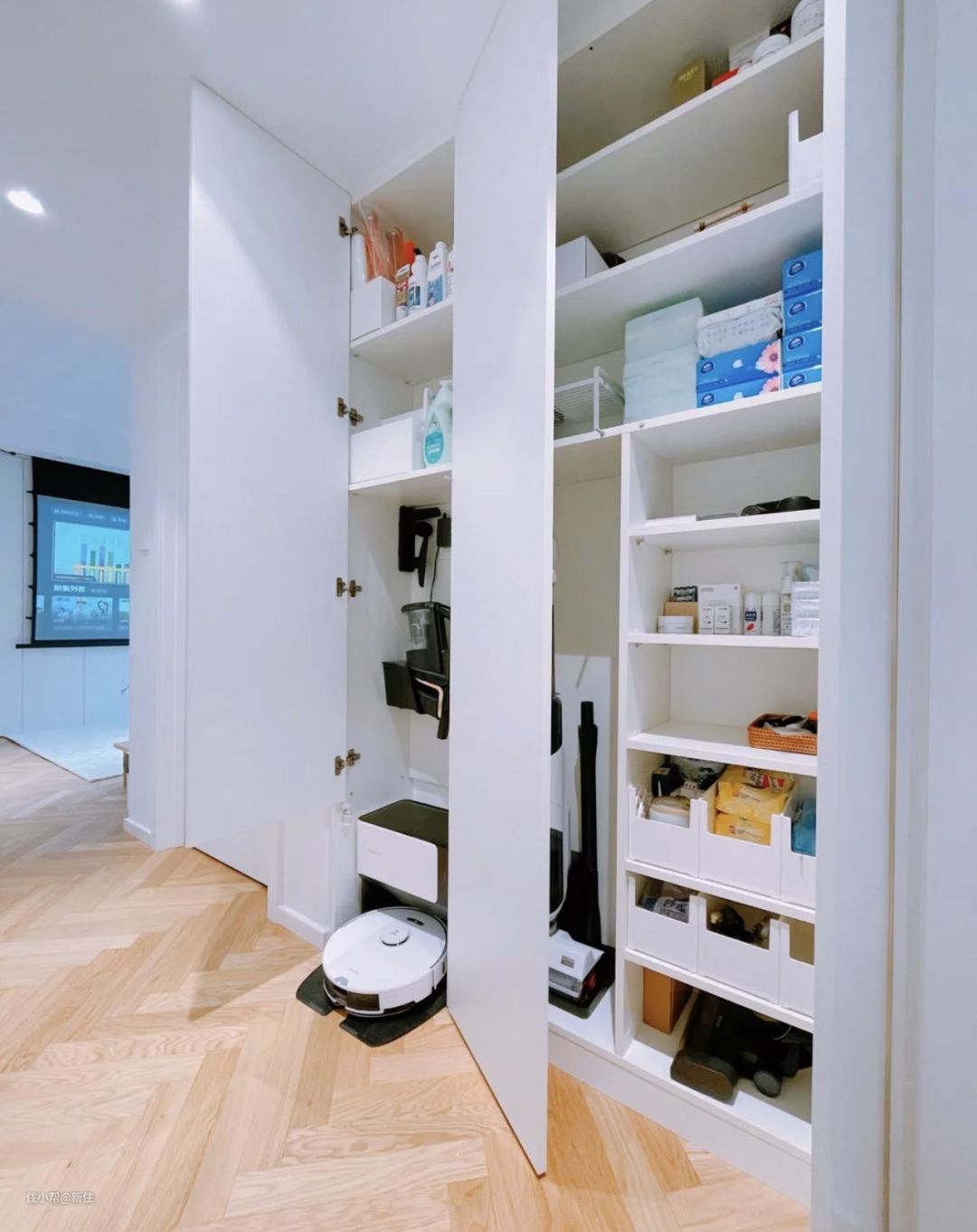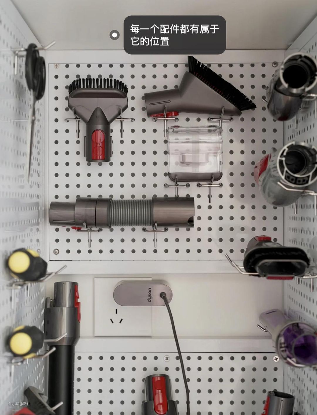 这家的吸尘器收纳,是我见过设计最合理的,柜内整个贴满洞洞板,吸尘器及各种配件都能挂上去,一目了然,视觉效果也很赞。