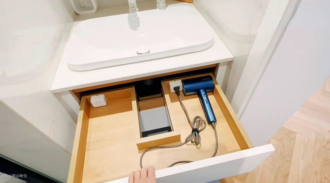 这位屋主的吹风机收纳设计,太合理了,在水电时就考虑到了,给浴室柜后方留了电源,将吹风机嵌入到抽屉里,用的时候,只需拉开抽屉就行,减少很多麻烦。