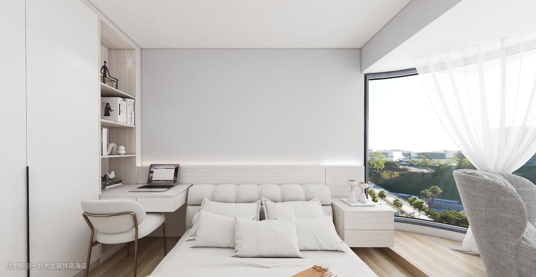 舒爽柔糯的棉麻床品,配色干净轻盈,弧形的整面落地窗,使得房间敞亮而高级,让人仿佛置身度假圣地