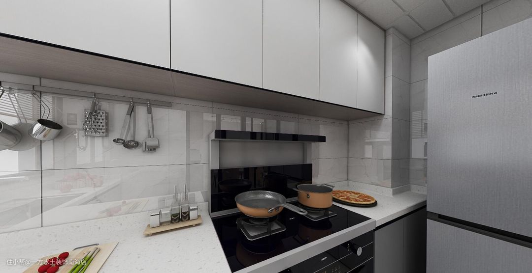 厨房使用的是集多功能于一体的集成灶,空间上有效的节省了厨房的使用面积,上方做高柜,最大化利用空间,以满足厨房各种物品的存放