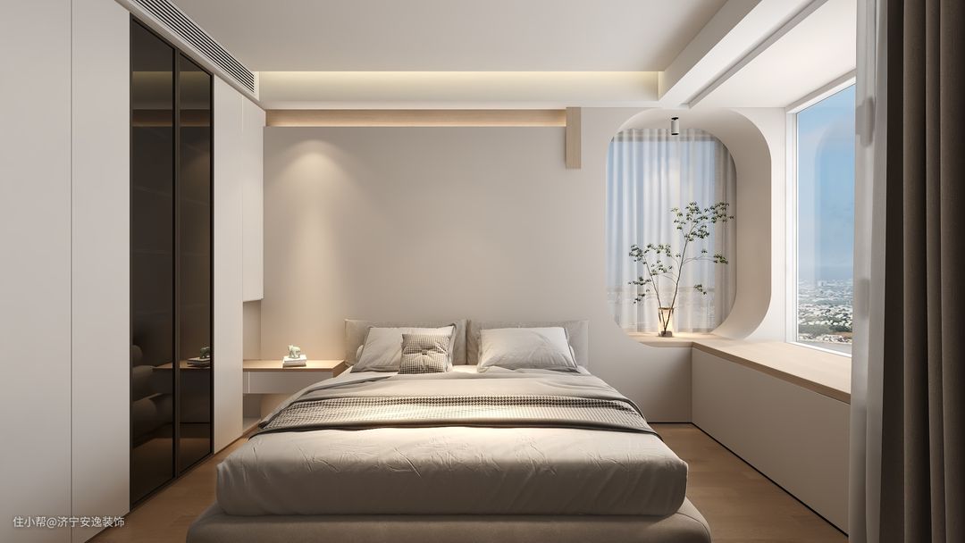 利用转角飘窗,床头背景墙与窗户连成一体,设计不一样的卧室蓝图,以白色为主,禅意雅静,透过白色纱帘,感受宁静的气息,增添一丝温暖,有种岁月静好的柔和美。