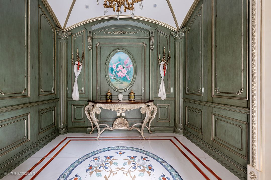 法式装修自带优雅浪漫的氛围感,在其中加入复古元素,会更加彰显高贵典雅,今天小岚就和大家分享一套法式复古风格的门厅与客厅的案例吧!