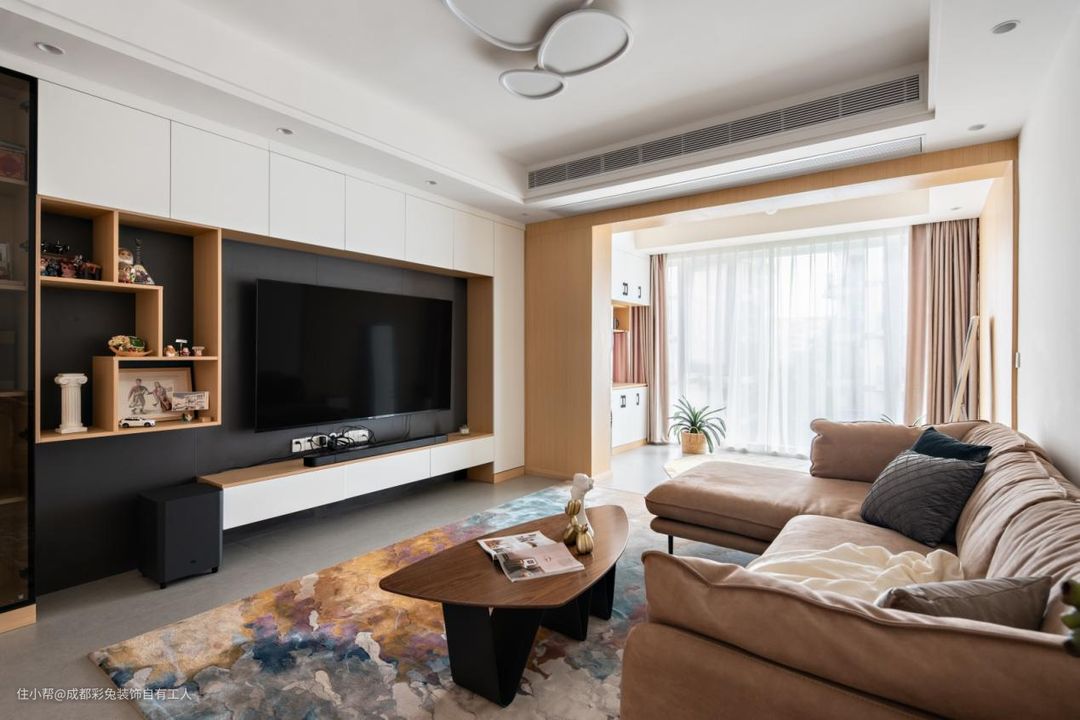 整墙定制的电视柜,不仅将收纳做到了极致,而且能够更加贴合客厅以及整屋的装修风格,特点是外观简洁、柜门平整,强迫症患者的福音。