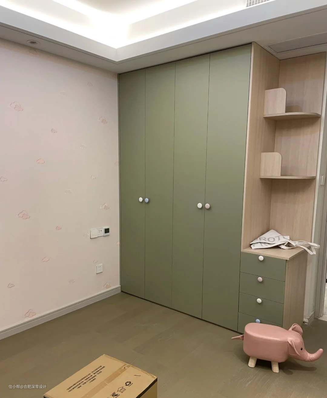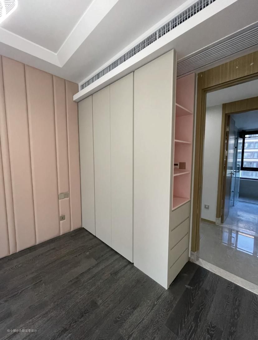 (Ps:也不是挑刺,看个人选择,开放隔板容易落灰,这点无比避免,在意的,可以在外侧装门,不过在高度尺寸上尤其要注意,以免和下凸的空调回风口网格打架,导致柜门无法全关。)