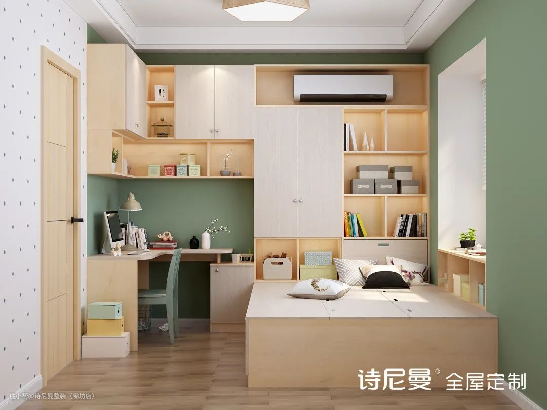 转角位还能定制小书桌,侧面设计成开放架用来放书,科学利用好每一寸空间。