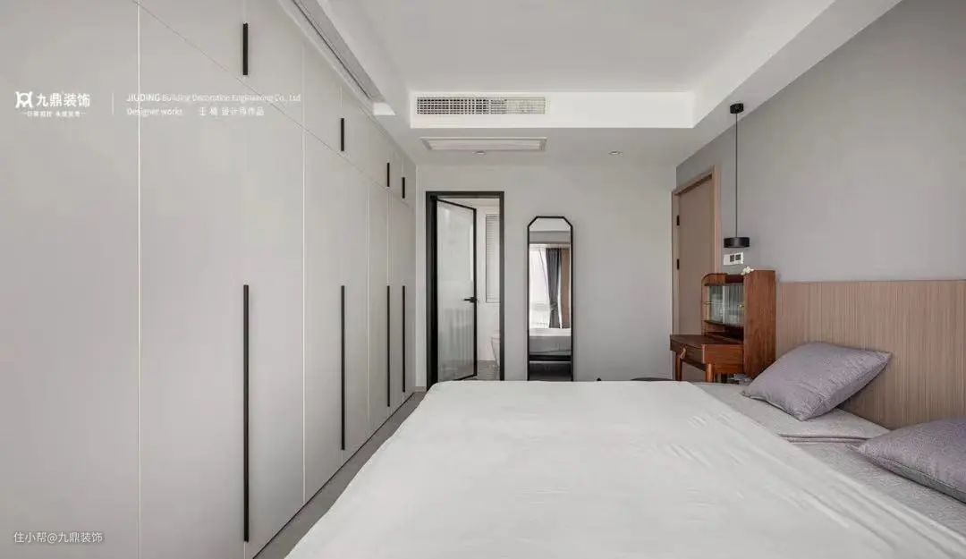 在卧室装一个嵌入式的衣柜,节省空间,还能增加一个衣帽柜,如果卧室空间太小,可以装成推拉门的柜子,留出一个走道,出行方便,拿取衣物也方便,若装双开门的话,会很占地方的。