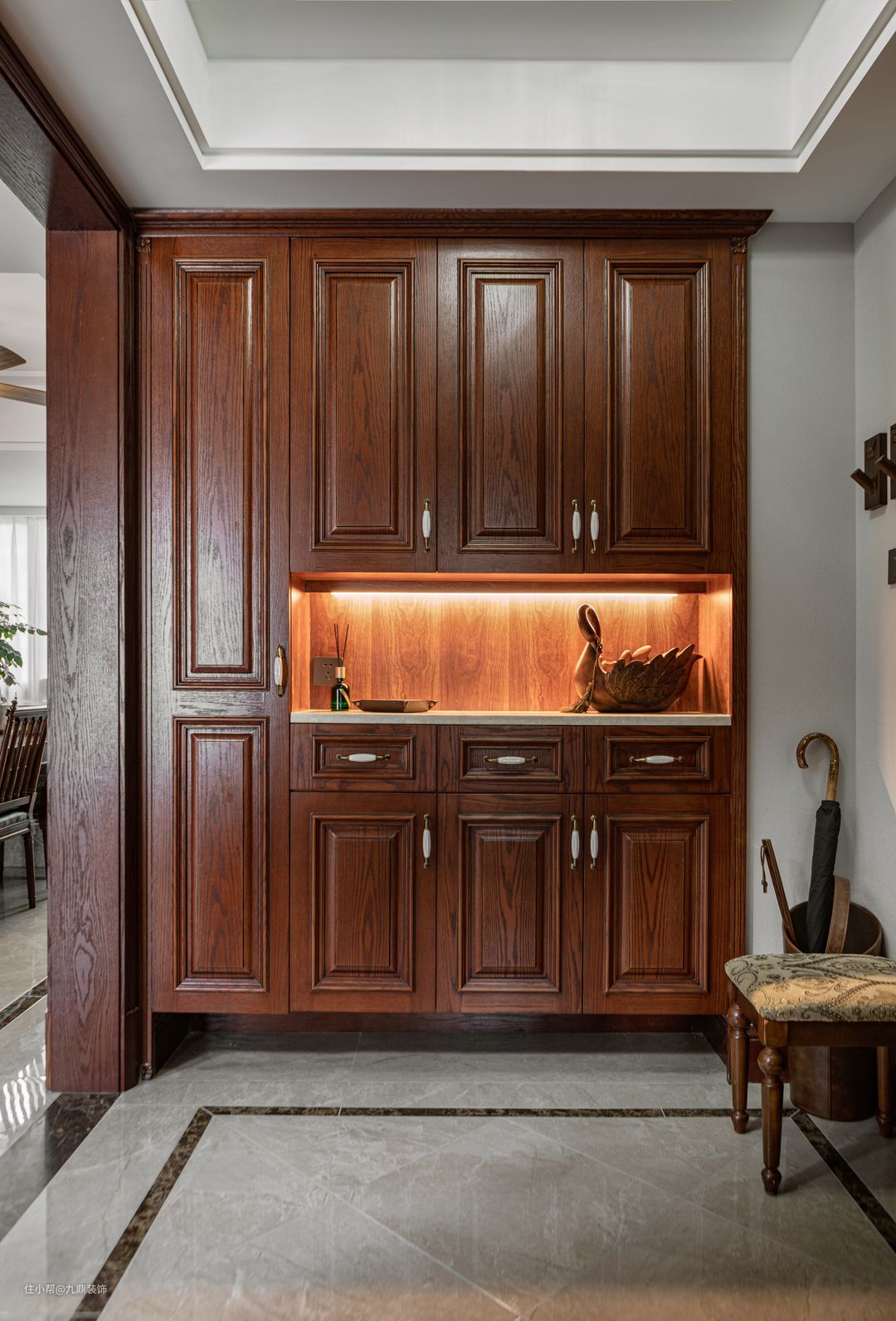 若你家房子是有走廊的,不必担心会浪费空间,沿着墙面打两排柜子,整洁美观还能收纳,一点突兀的感觉都没有,可以当作衣柜、鞋柜、储物柜都相当不错的,或者是有些家庭比较讲究风水,可以在柜子的两侧挂一些风景山水画还能提升走廊的颜值。