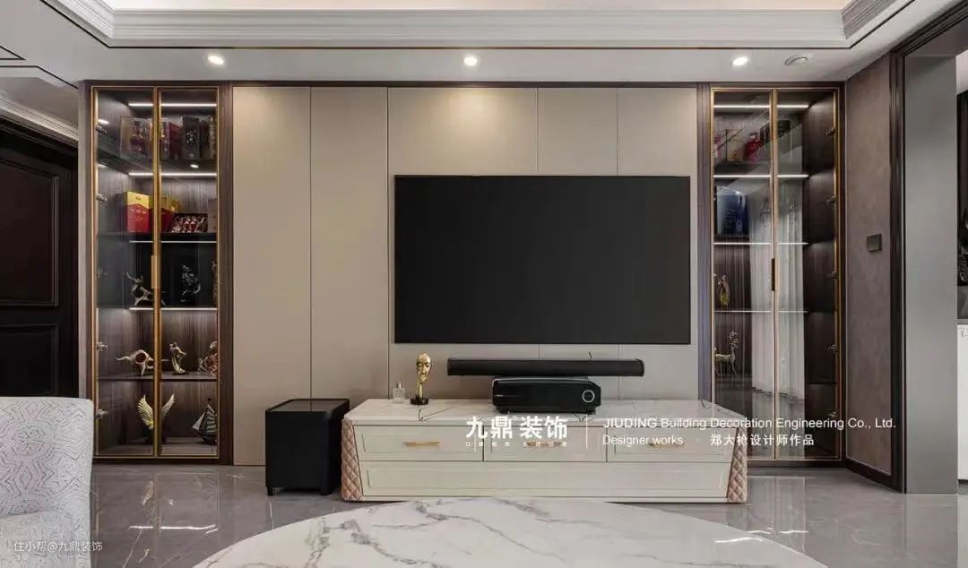 可以设计成书柜、展示品柜子、酒柜、收纳柜、如果户型特殊,当然在背景墙的两侧还可以设计隐形门,这样能节省很大一部分空间,隐形门的门板材质和背景墙一致,一眼望去就是一整面背景墙的感觉,整洁大气又有创意。
