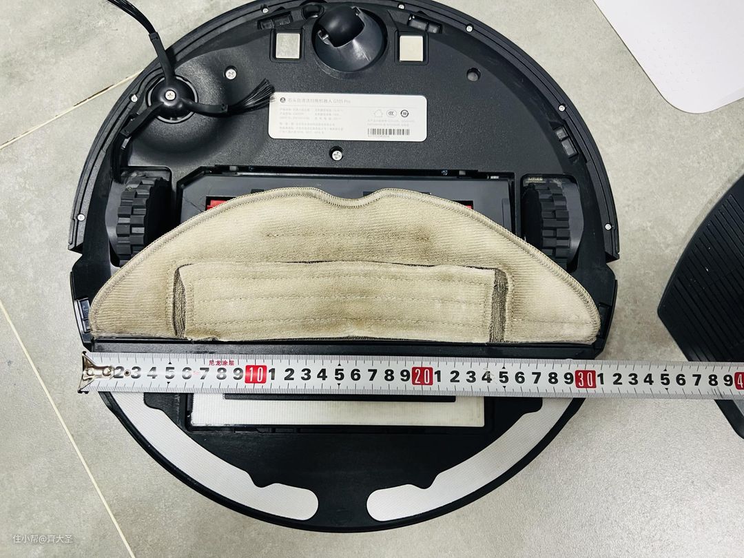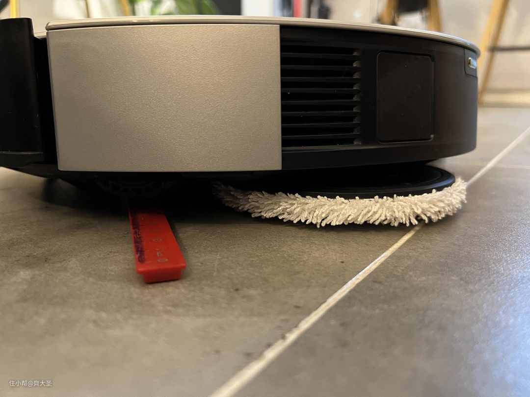 就是靠机器的自重将拖布压在地面上,但是这一前提是保证拖布平面的水平,比如下图这种情况,由于扫地机在工作中被格尺等物品垫起,这样一来拖布的下压力就会大幅减少甚至消失,导致清洁效果大打折扣。