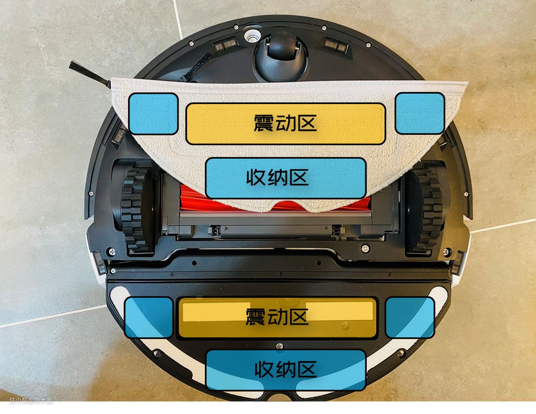 而石头则比较另类,独辟蹊径的采用了可升降的声波震动拖地方案,整个拖布分为震动区和纳污区。