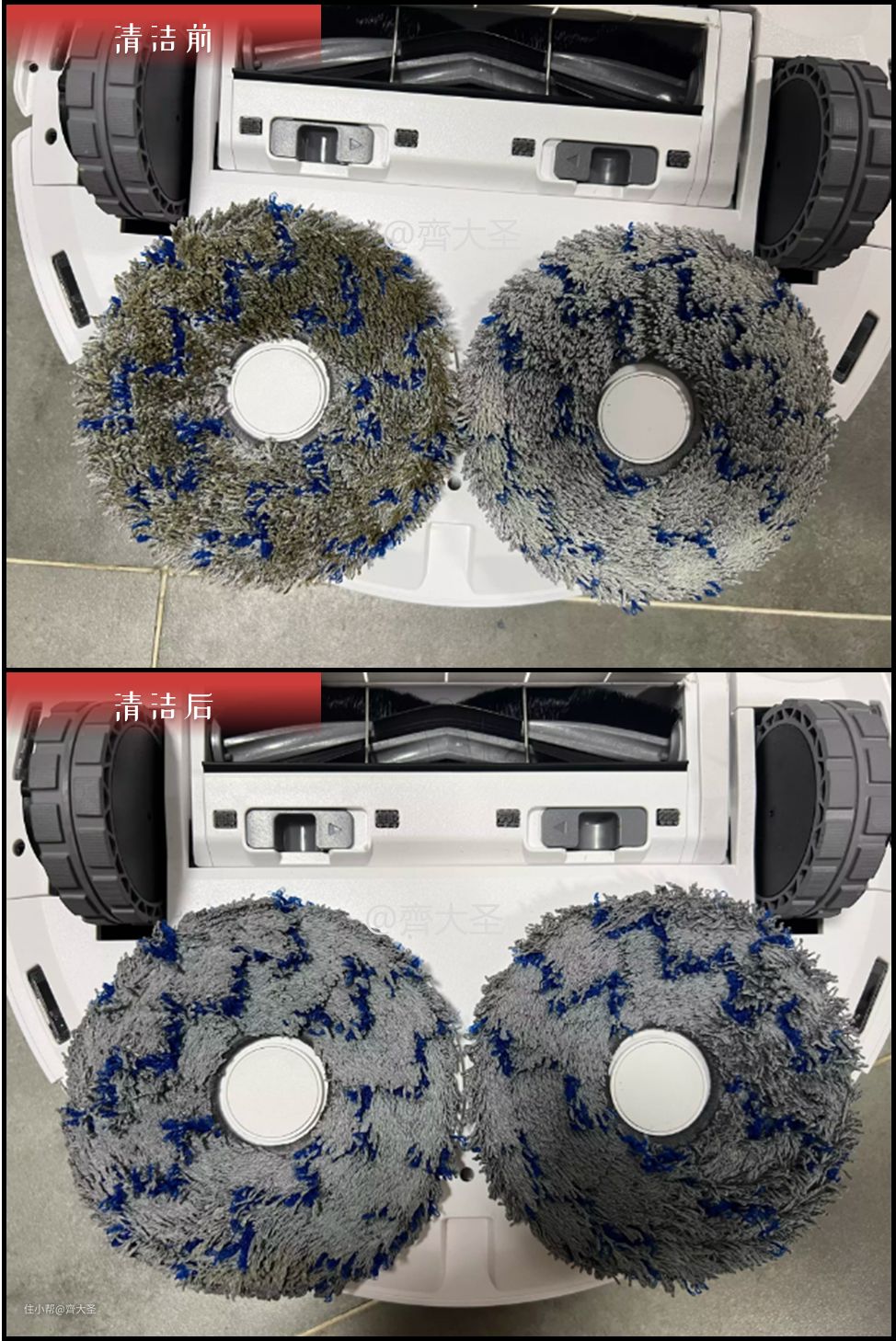 而为了解决这一问题,要么增大前期拖布吸水量,这也是为什么四个拖布的360要相对好一些的原因;