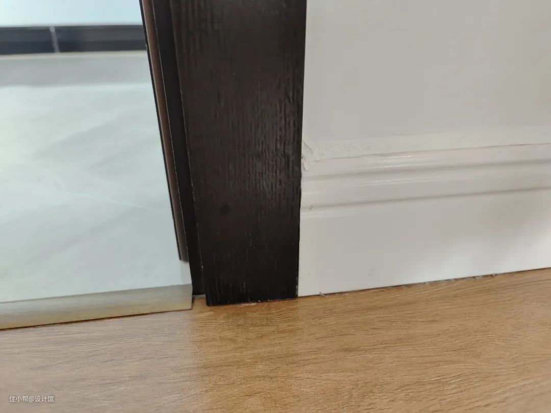 如果是木质踢脚线的话,则是在装木地板与踢脚线的时候,把靠近房门区域的踢脚线留一段不装,等房门装好后,根据剩余的尺寸把踢脚线切割了再装进去,实现踢脚线与门套线的完美衔接。
