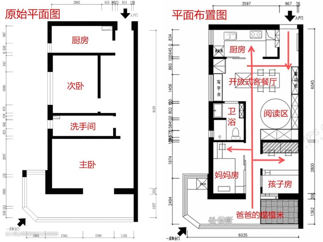 - 原次卧+过道,改为开放式客餐厅+阅读区