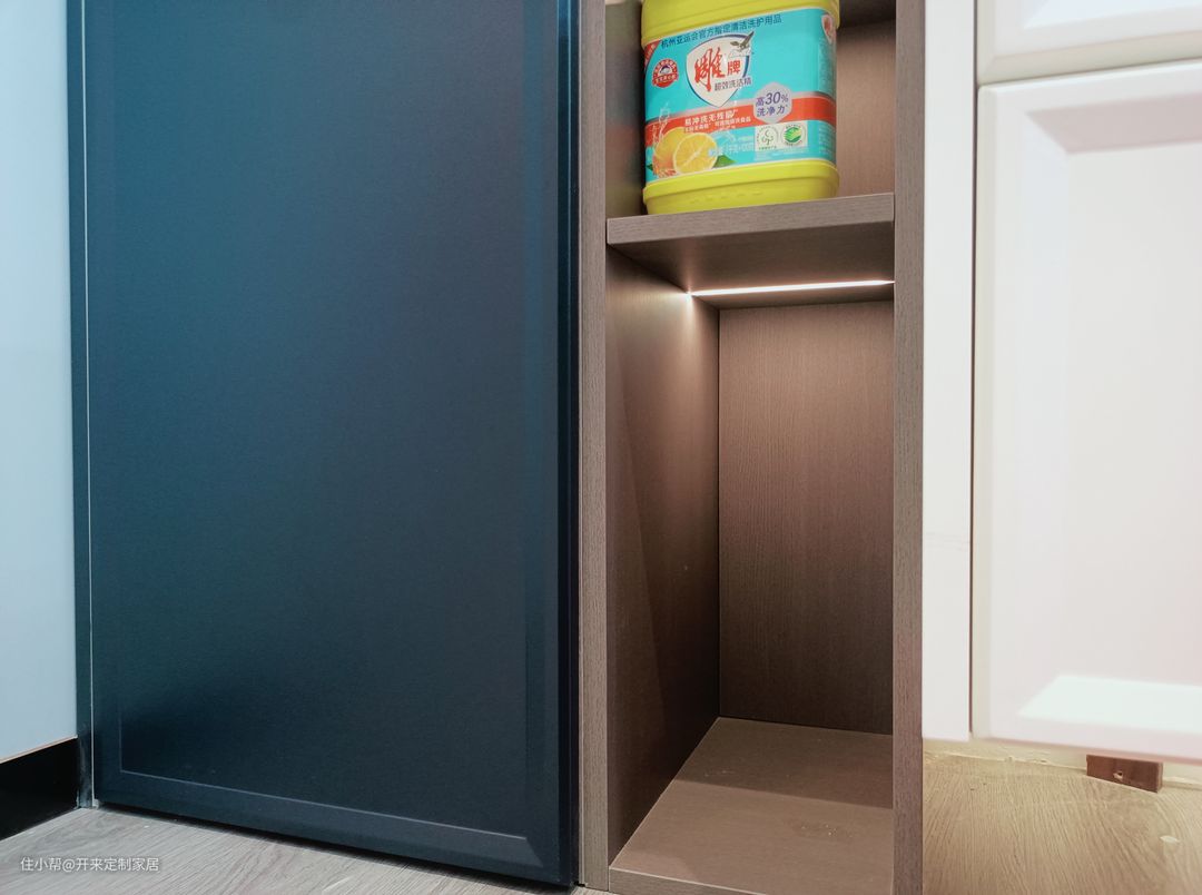 高柜打造卫浴用品上墙收纳空间,结合通顶开架,收纳清洁工具及沐浴露、洗发水、牙膏、牙刷、毛巾、浴衣、洗衣液等大小件的生活用品,减少堆叠在水池柜台面或地面上,使得浴室看起来整洁干净~