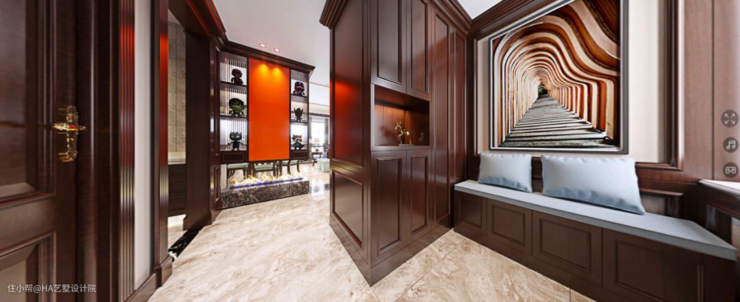 进门玄关处地板采用米色的有花纹质感的大理石瓷砖铺装而成,给人一种暖洋洋的感觉,右侧的墙面采用红棕色饰面板铺设,上面搭配了壁画,画面上是由中心点向四周发散形成的走廊形式,下方打造了换鞋区,配备了换鞋凳子,上面铺设了乳胶垫,能够让人坐上去很舒服。
