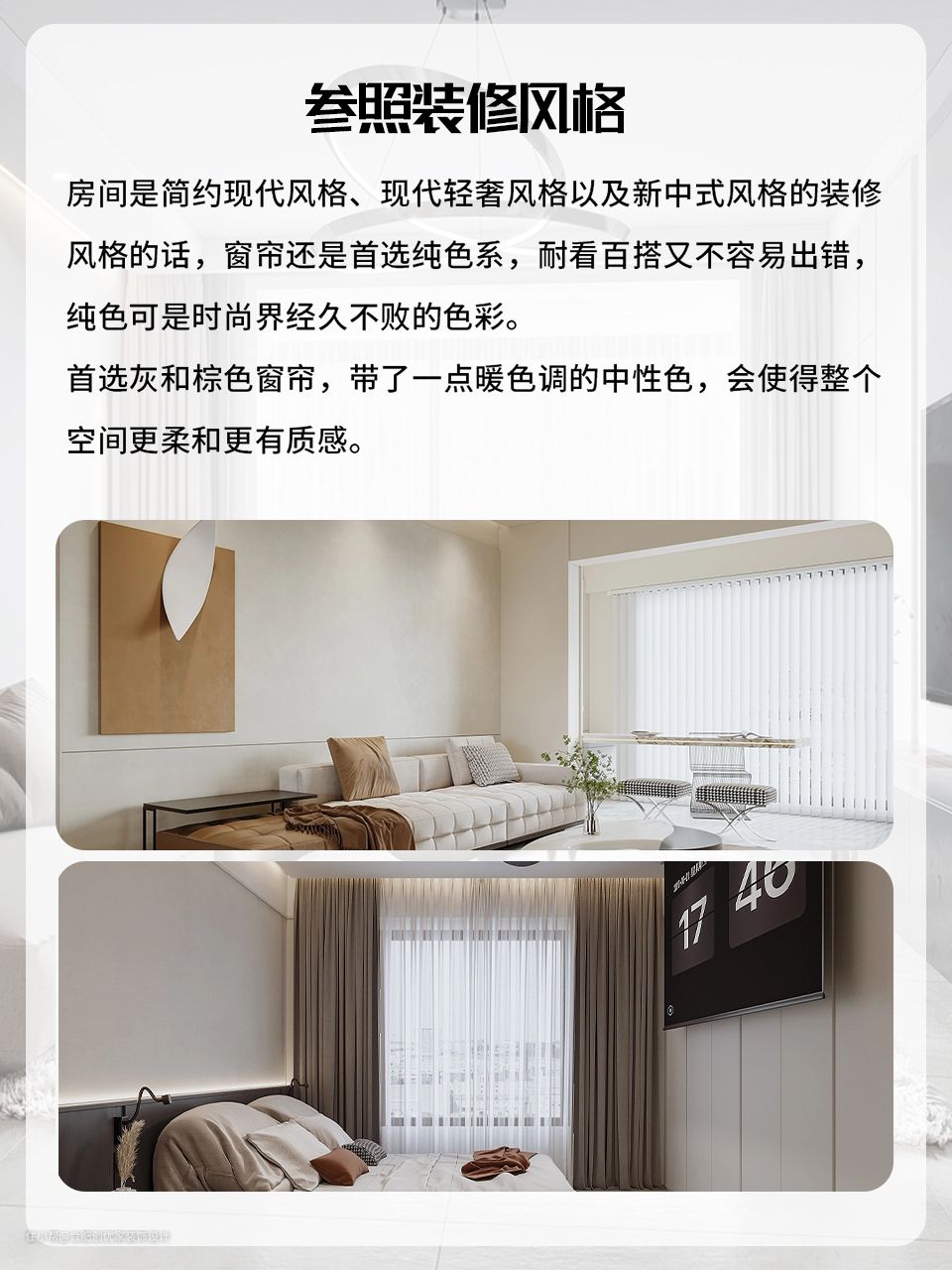 3. 参考装修风格,比如简约现代风格,现代轻奢风以及新中式风格装修都可以首选灰和棕色窗帘,,带了一点暖色调的中性风,会让整体空间更柔和更有质感。