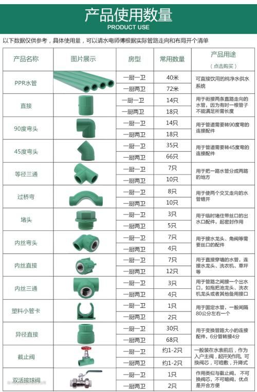 关于水管配件的大概使用数量,以一厨一卫及一厨二卫为例: