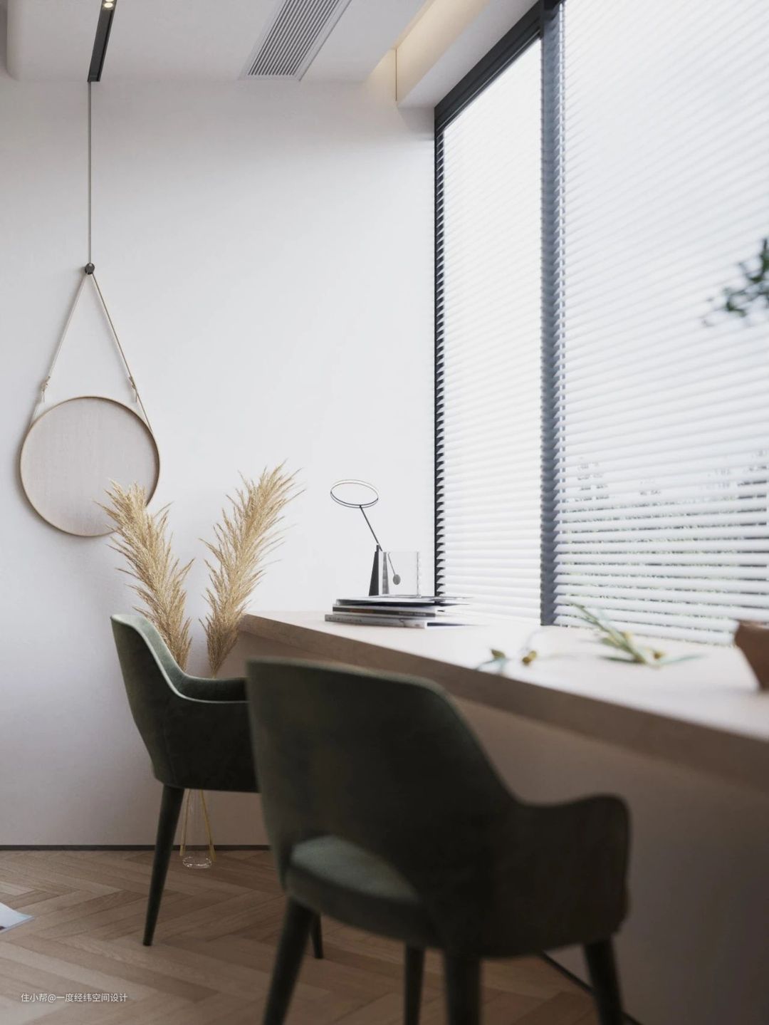 纯白的百叶窗柔和了光线,长形木质书桌沿着窗台放置,让卧室也可以变成小书房,除了休息还可以阅读与办公的功能选择,将空间的功能性挖掘至最大化。