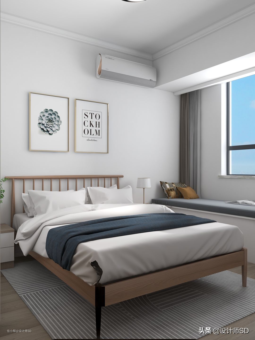 顶面没有做吊顶,而是用石膏线条走一圈顶面,挂机挂置于床头上方,整个墙面都是用白色的乳胶漆,搭配一组简约的装饰挂画,让小空间也显得温馨舒适。