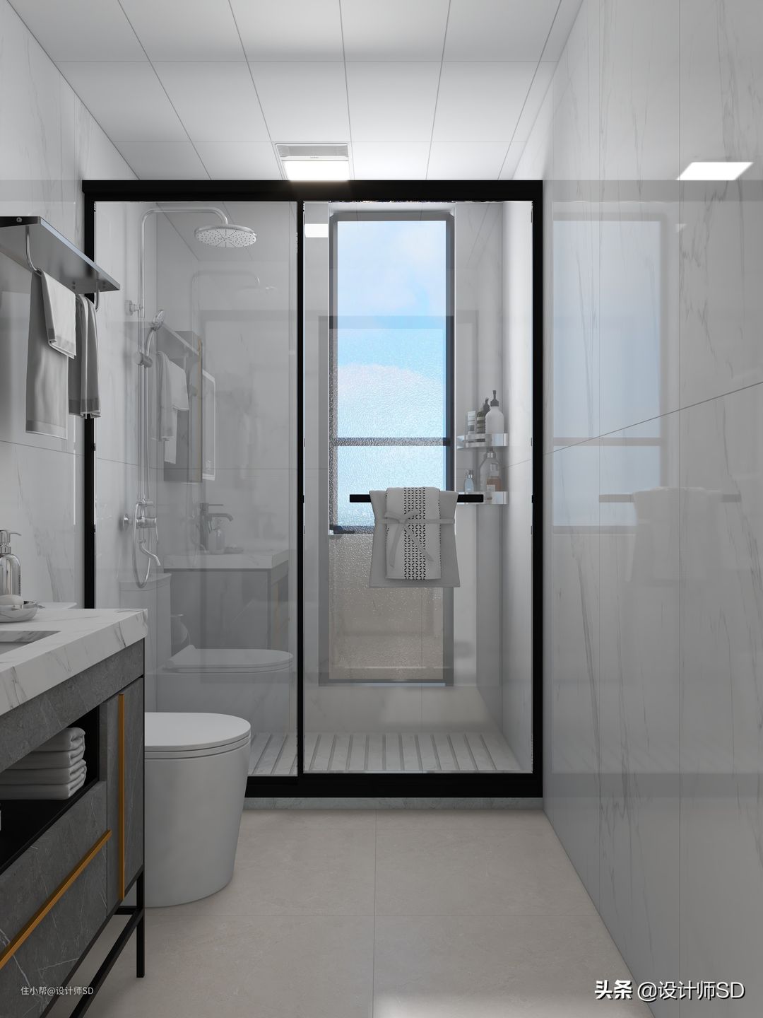 主卧的主卧,在空间尺寸充足的情况下,布置了有0.8米宽的浴室柜,深色的下柜搭配智能镜,美观又实用。中间预留了0.8米的马桶空间,两侧跟上方还放置了五金挂件。最右侧预留了1米的一字型推拉淋浴房,黑色的边框搭配透明的玻璃,下面还做了防滑槽的铺贴。
