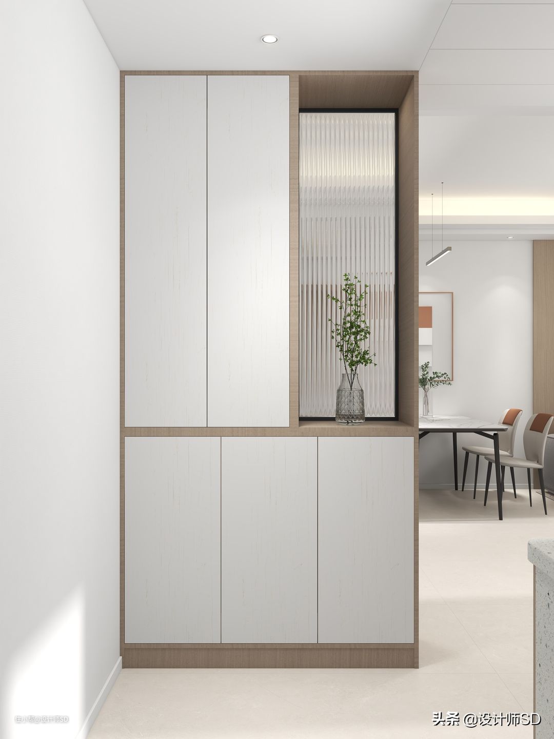 入户门进来后,就可以看到鞋柜的布置了,宽度在1.2米,分了三扇门,也分了下柜跟上柜,原木色的柜体搭配白色的柜门,为了让空间更加显得简约干净,没有考虑在门上面安装拉手,而是采用反弹器来让门的开关更加便捷。为了不让大面积的柜子显得压抑,而是在上柜的右侧做了一个开放的空间,后面安装带有黑色边框的长虹玻璃,下面摆放一盆绿植,也可以放置些进门后的随手物件。简约干净又实用。
