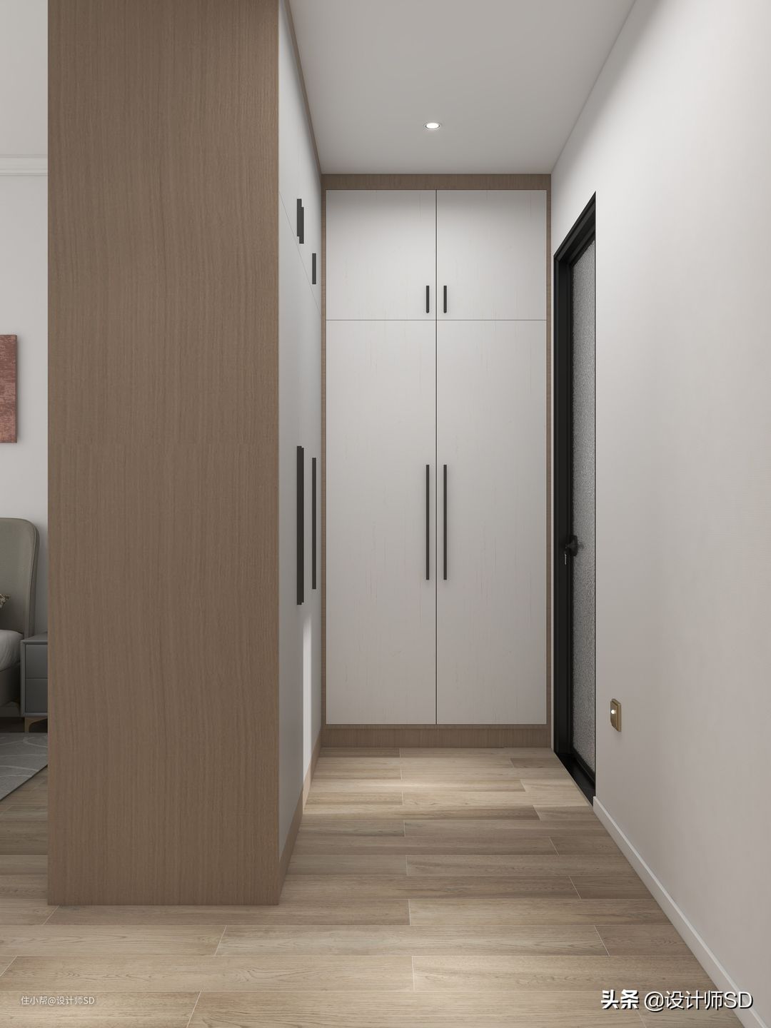 主卧的第一视觉的衣帽间的空间,右侧的主卫,为了放置卫生间的门对着窗体,所以做了一组L型的衣柜挡着。原木色的柜体搭配白色的门,再配上黑色的拉手,门的尺寸还是比较大,装拉手方便使用一些。