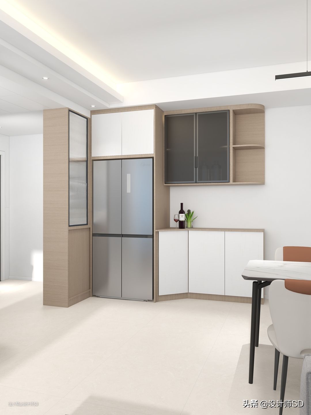位于餐厅区域,冰箱跟酒柜的布置,左侧的冰箱柜体做深,让冰箱看上去是嵌入式,但也需要留散热空间,上方到吊柜也做了两扇柜门,右侧则是餐边柜酒柜的布置,让整个柜体显得一体,在地柜交接的位置,做了斜角的造型,右侧两扇柜门的柜体深度是300,很好的过度了冰箱柜跟浅一些酒柜的收口,(如果不做斜角,会显得很生硬)