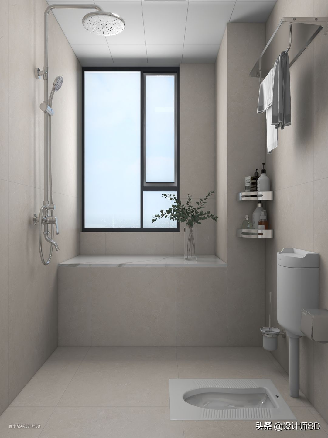 靠湿区的里面是安排了蹲便器跟花洒的空间,原始结构上有飘窗的,所以用来放置物品很不错,也让湿区的空间显得更大,墙面600*1200的哑光砖,地砖则加工600*600对缝铺贴,飘窗台面铺贴一块白色的大理石。顶面则是300*600的铝扣板跟风暖。