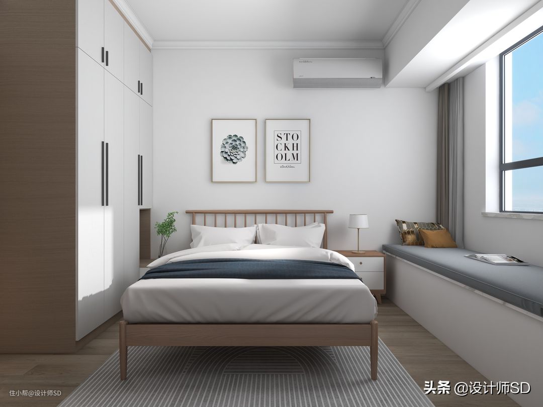 次卧的空间不是很大,不计算飘窗的尺寸是3.2米宽*2.65米的长,所以在做衣柜布置的时候,考虑将床头柜一起制作,整体好用的情况下靠床头的一侧柜门还可以打开。