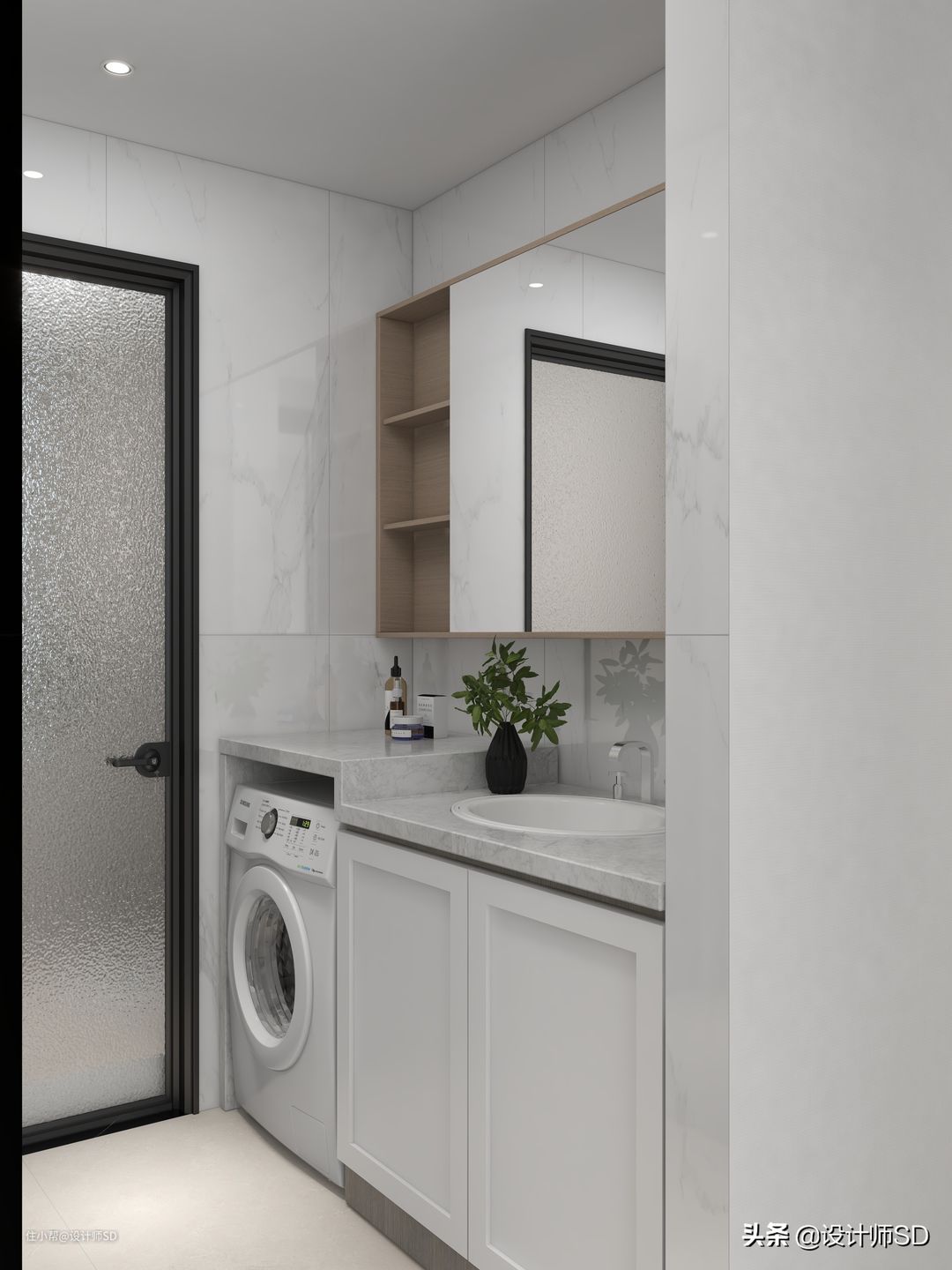 靠近过道的卫生间,设计的干湿两分离的空间,由于阳台的尺寸不是很充足,所以将洗衣机跟浴室柜制作成一体,让干区的空间大化的同时也让洗衣机有合理的位置摆放。上镜柜的左侧做了开放的格子方便置物,镜子的背面还可以做层板格子,让收纳空间更加的强大。